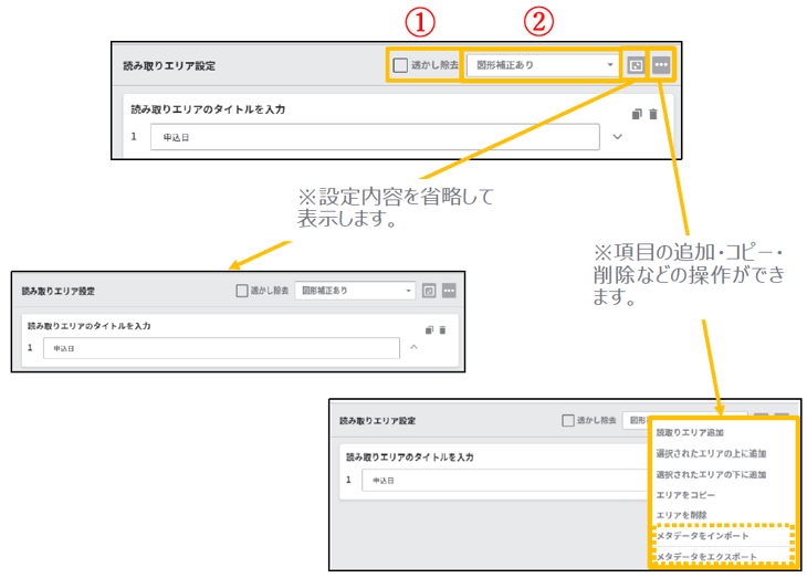 ①と②の内容の説明は以下の通りです(定型帳票(読取座標を設定する場合)のみ)。