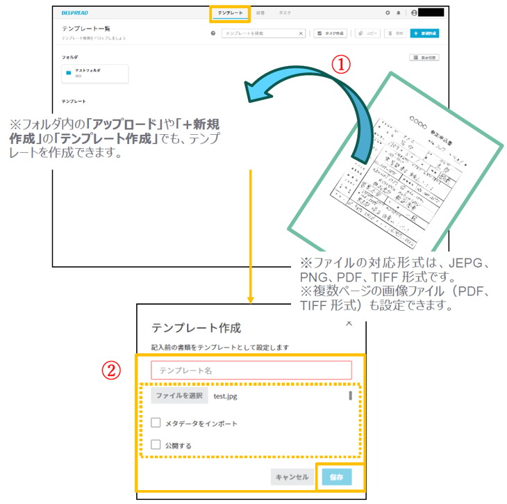 | ※「ファイルを選択」:テンプレートを作成するファイルを指定することができます。 ※「公開する」:テンプレートの公開/非公開を設定できます。 ※「メタデータのインポート」:テンプレート設定ファイル(メタデータ)をインポートすることができます。 ※「非定型帳票」(非定型読取をご利用の場合のみ):非定型帳票(読取座標を設定しない場合)を設定できます。 |