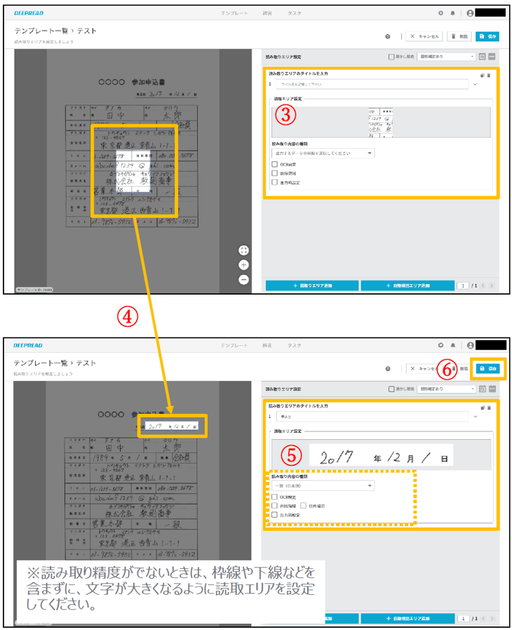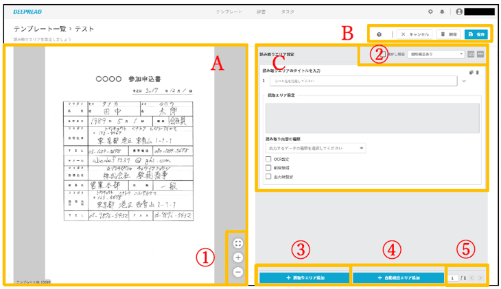 読取エリアの設定画面![]() A 読取エリアの設定対象画像 B テンプレートに対する各処理を実行するボタン C 読取エリアの名称や範囲、使用する読取モデル、その他の設定を行う領域 ※読取エリアをドラッグして動かすことで順番を並び替えることができます。 ①画面の拡大縮小ができます。 ②テンプレート全体に対する操作ができます。 ③読取エリアを追加できます。 ④読取エリアの自動検出ができます。 ⑤設定項目を20個ずつ表示します(20個を超える場合は次項になります)。 ※「<」、「>」、または直接ページ数を入力することでページを移動できます。 |